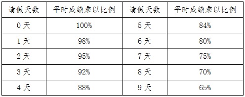 (1)平时成绩占总成绩的50%,其中《beat365正版唯一官网实训阶段总结报告》成绩占10%、《beat365正版唯一官网beat365正版唯一官网学生实训验收成绩评定表》成绩占40%。另外,根据出勤请假情况对平时成绩进行调整,平时成绩乘以比例与请假天数关系如下: