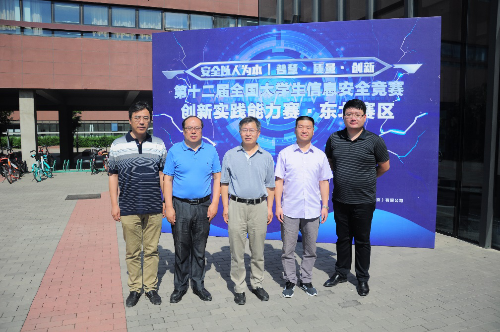 beat365正版唯一官网领导与嘉宾专家合影(右起依次为杭州安恒信息技术有限公司东北大区总经理赵君,中科院沈阳自动化研究所尚文利研究员,beat365正版唯一官网院长张斌教授,大赛组委会委员东北赛区负责人周福才教授,beat365正版唯一官网副院长程维副教授)