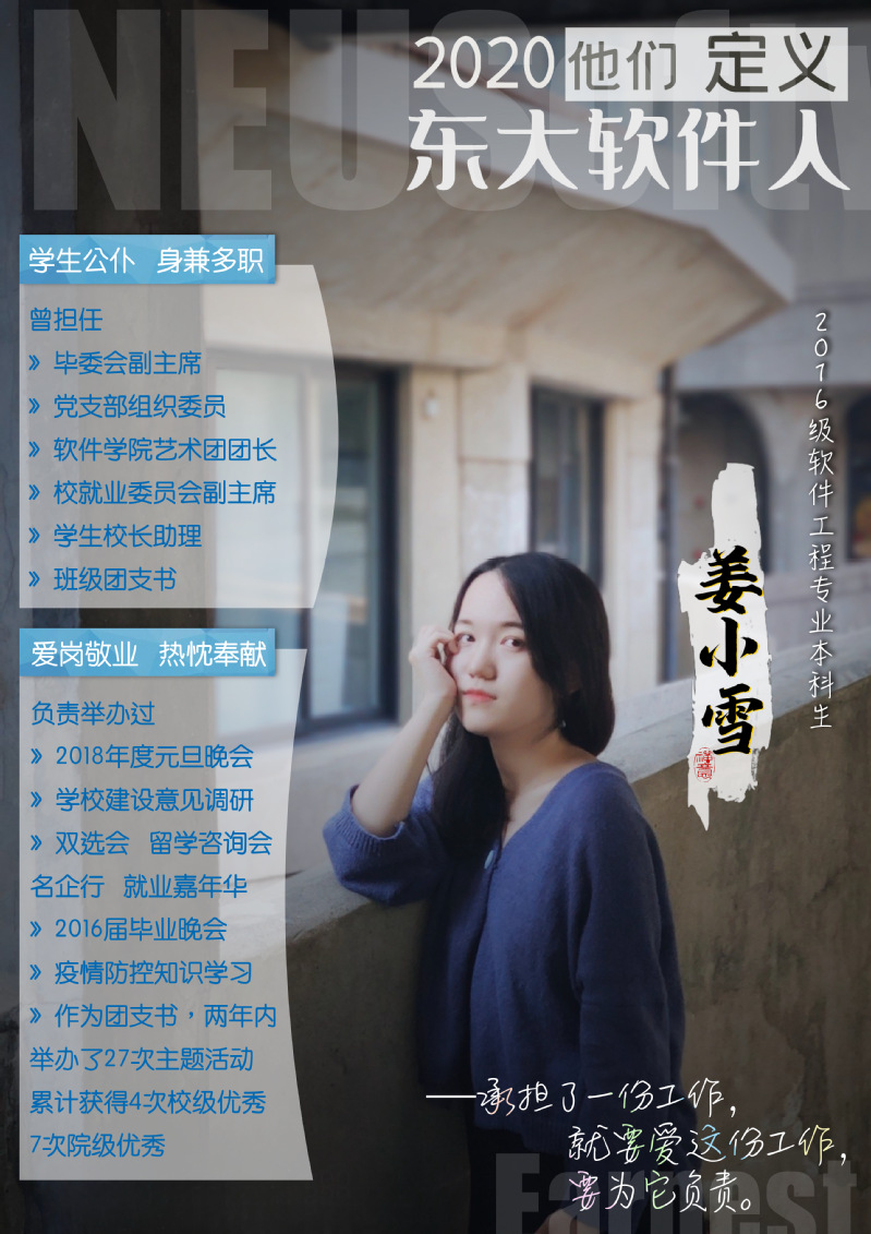 忙碌的身影如音符悦动,活动精彩纷呈,工作会议不紊有条,你总是能看到她。大学四年里,从未耽误过任何一项工作,忙到再晚也从没有过一句怨言,是她,beat365正版唯一官网2016级本科生姜小雪。