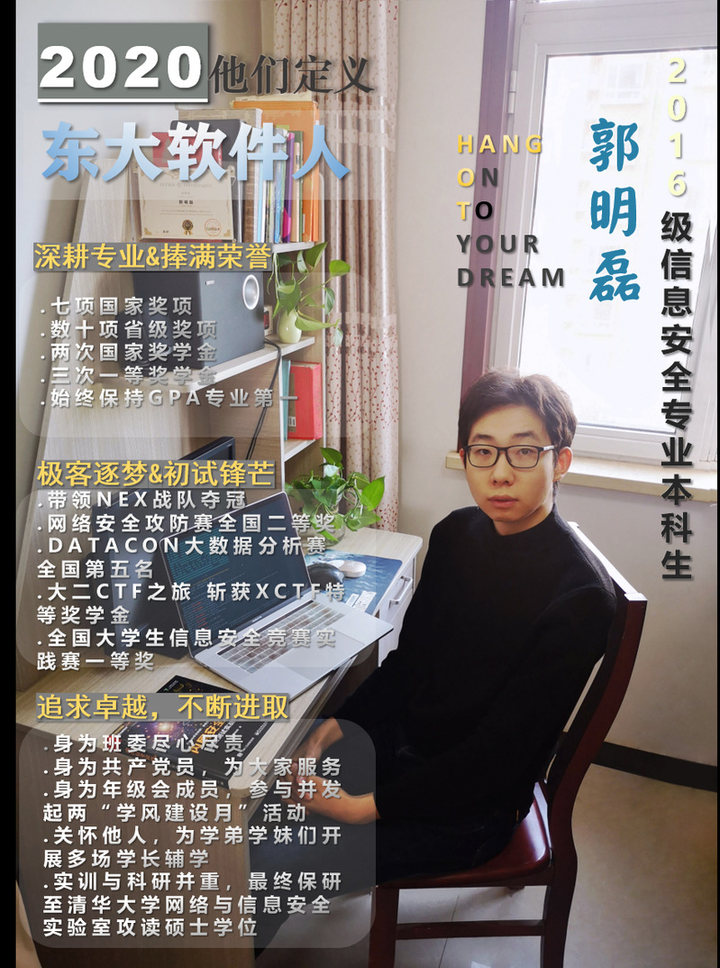 今后,郭明磊仍会秉承“自强不息,知行合一”的信念,勇攀高峰,将青春奉献给理想,努力成为未来中国网络空间安全领域的优秀人才,为祖国的网络安全事业,为美丽的中国梦贡献自己的力量。