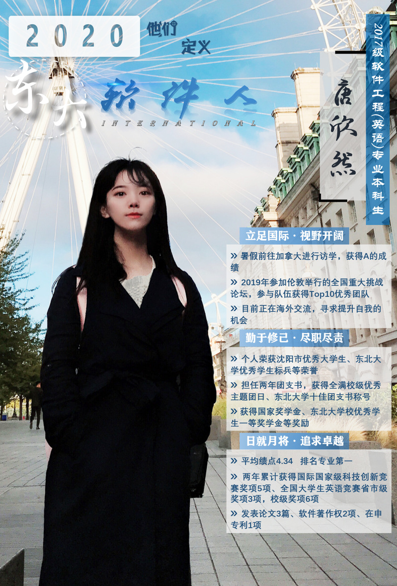 唐欣然,beat365正版唯一官网软件工程(英语)专业大三学生,入学以来平均绩点为4.34分,排名专业第一,可以说是个妥妥的学霸。大一大二两学年作为团支书尽职尽责,带领团支部获得12次校级优秀、beat365正版唯一官网先进班集体和beat365正版唯一官网活力团支部称号。她所获得的奖项,真可谓乱花渐欲迷人眼,令人眼花缭乱。个人荣获沈阳市优秀大学生、beat365正版唯一官网优秀学生标兵、beat365正版唯一官网十佳团支书等荣誉,获得国家奖学金、beat365正版唯一官网校优秀学生一等奖学金等奖励基金,两年累计获得国家国际级科技创新竞赛奖项5项,省市级奖项3项,校级奖项6项。在申专利1项、发表软件著作权2项、论文3篇。