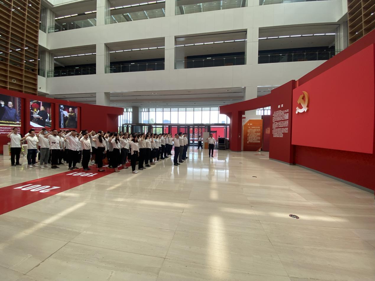 步入展厅,鲜红的党旗和金色的党徽熠熠夺目。全体党员庄严肃立于党旗前,由学院党委书记滕超领誓,重温入党誓词,为共产主义奋斗终身的誓词铿锵有力、响彻大厅。