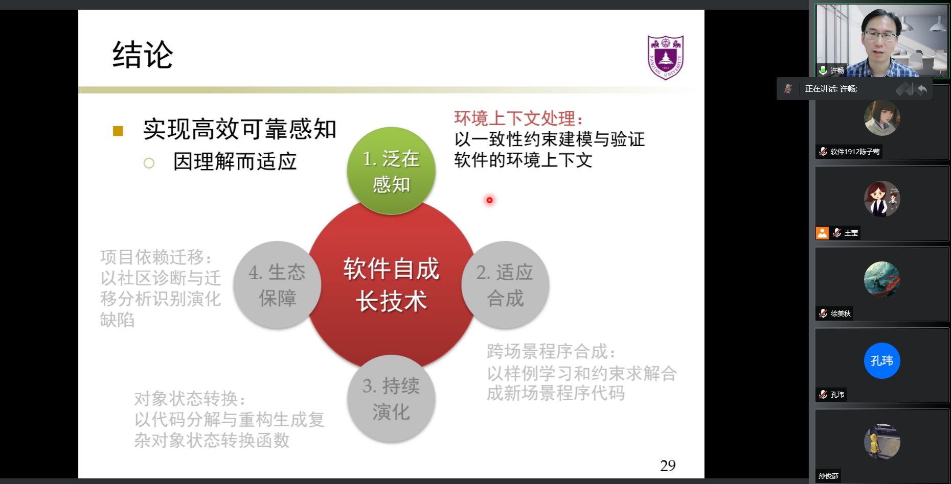 在讲座开始之后,许教授首先介绍了问题的背景,在当下随着业务增长,软件复杂度增加的情况下,由于环境、资源、需求变迁,软件长期生存变得困难,软件可成长性面临着感知、适应、演化等方面的挑战,引入了自成长模型与自成长生态两个概念,并指出了两条路线:包括挖掘软件适应潜力与增强软件更新能力。讲座主要内容分为四部分:泛在感知:环境上下文一致性的迷惑;适应合成:跨场景程序自合成的适配;持续演化:对象状态版本转换的神秘;生态保障:项目依赖进化迁移的躺平。最后许教授对讲座内容进行总结,并且指出了相关技术的应用场景。