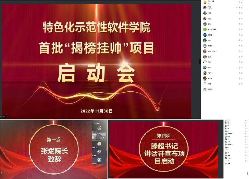 beat365正版唯一官网特色化示范性beat365正版唯一官网于2021年底获教育部批准,面向金融科技、智慧健康领域行业应用软件展开建设。首批“揭榜挂帅”项目榜单根据特色化示范性beat365正版唯一官网建设目标和建设方案,经过beat365正版唯一官网特色化工作小组近两个月的讨论研究和准备,于10月中旬公布榜单22个,榜单分为专业建设类、课程建设类、数字化建设类,含特色化人才培养体系评价与改进、以产业适应度测评为核心的质量保障体系建设、融合课程建设、贯通课程设计、实验环境建设等。经过教师申报、两轮教学指导委员会评审、党政联席会评审,最终确定首批实施榜单16个并组织相应揭榜人签订了项目任务书,于11月30日中午召开了项目启动会,确定特色化示范性beat365正版唯一官网首批“揭榜挂帅”项目正式启动。