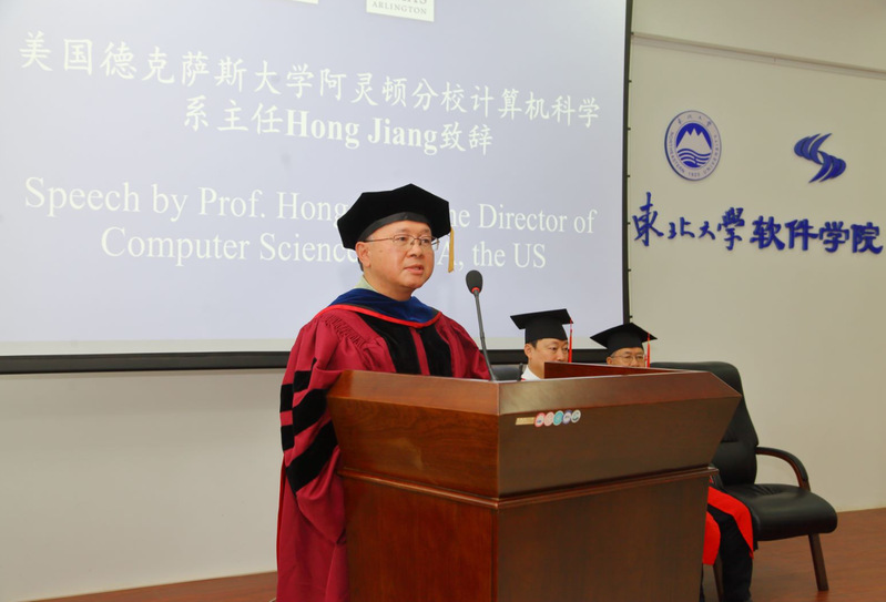 典礼上,JiangHong代表德克萨斯大学阿灵顿分校向2023届学生表示祝贺,并鼓励同学们发挥个人优势,在未来的工作学习中取得更好的成绩。