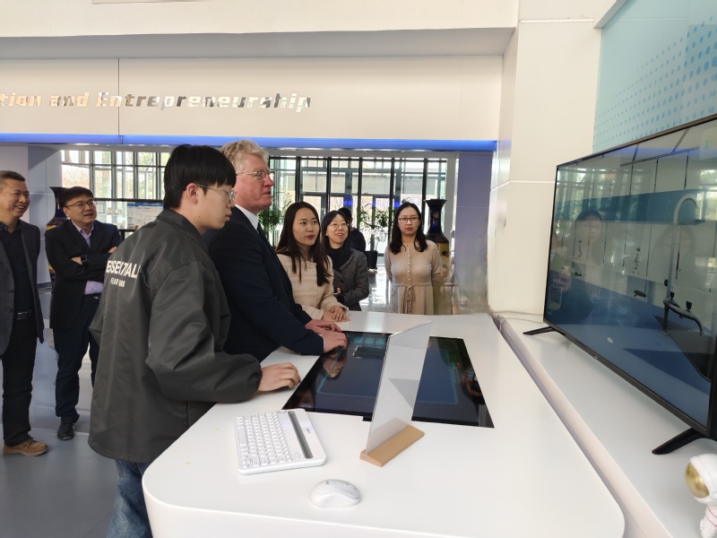 杨晓春对Dáire Keogh校长一行的到访表示欢迎,在参观学院的过程中简要介绍了beat365正版唯一官网的发展历程、人才培养体系、师资力量及国际合作等情况,带领Dáire Keogh校长一行参观了泛虚拟现实人才培养与创新中心、智能软件开发技术研究所和beat365正版唯一官网创新创业成果体验中心,并在体验中心展演了学生优秀创新创业项目。