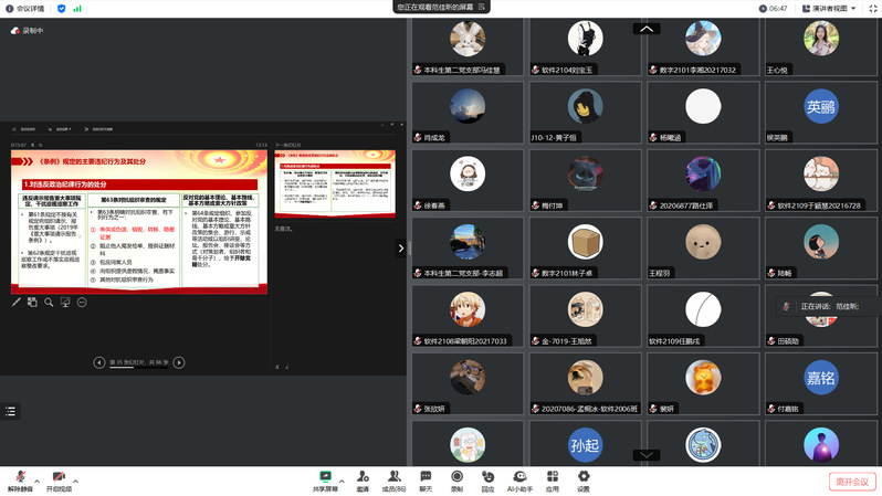 5月21日,beat365正版唯一官网学生党总支组织全体校外学生党员开展线上党纪专题学习教育,学校党纪学习教育宣讲团成员、学院纪委书记任涛应邀授课,学院全体校外实习实训、留学交流的学生党员共计86人参加学习。