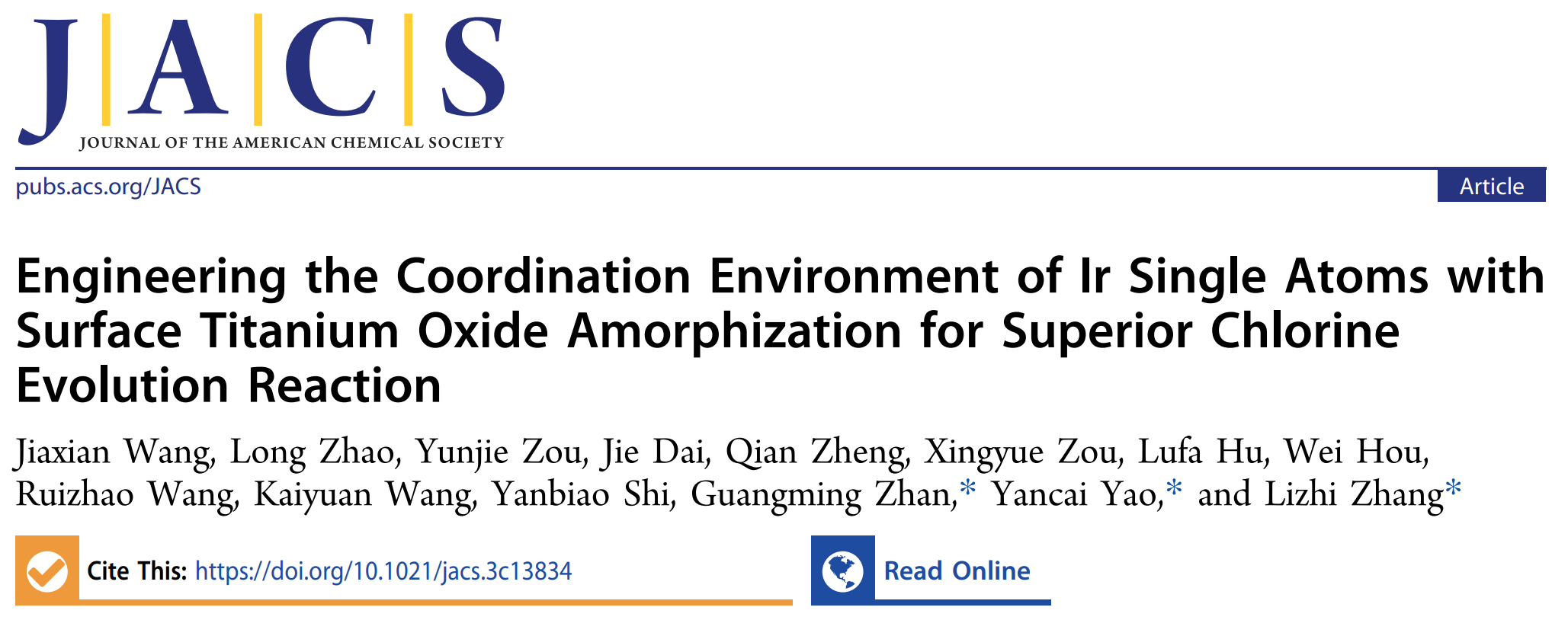 环院智慧|张礼知团队在J. Am. Chem. Soc. 发文报道铱单原子配位环境的钛氧化物表面非晶化调控及其超级析氯性能