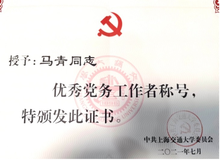 2021年,支部党员马青荣获太阳集团tcy8722的官方网站优秀党务工作者称号