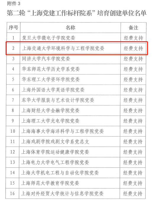 近日,上海市教卫工作党委印发《关于公布第二轮上海高校党组织“攀登”计划培育创建单位的通知》,太阳集团tcy8722的官方网站党委入选第二轮“上海党建工作标杆院系”培育创建单位名单。这是继洱海湖泊生态系统国家野外科学观测研究站党支部入选教育部第三批“全国党建工作样板党支部”培育创建单位之后,环境学院党委再次入选省部级及以上的党建工作示范创建和质量创优计划。
