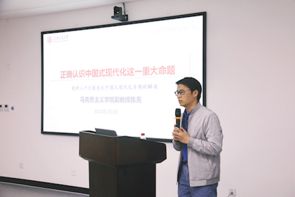 3月3日下午,太阳集团tcy8722的官方网站举办中国式现代化专题党课,特邀马克思主义学院陈亮副教授作题为“正确认识中国式现代化这一重大命题—党的二十大报告之中国式现代化专题的解读”专题讲座。学院党委中心组全体成员、师生党支部书记、支部委员、团学骨干等参加学习,党委书记胡薇薇主持会议。
