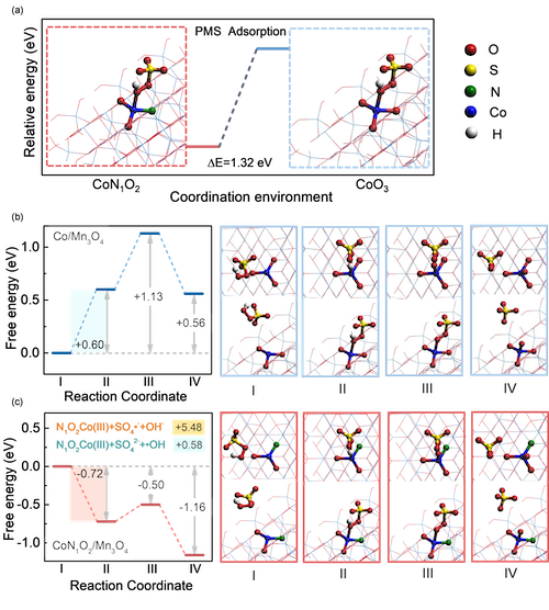 图5 DFT模拟揭示PMS在CoN1O2/Mn3O4表面活化产生CoIV=O的过程