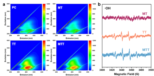 图5 不同老化条件下渗滤液中(a)DOM的荧光光谱;(b)·OH的EPR光谱