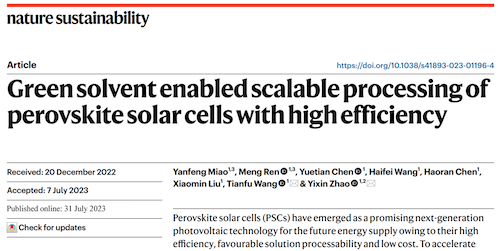 环院智慧|赵一新教授团队Nature Sustainability:大面积钙钛矿光伏组件的绿色制备