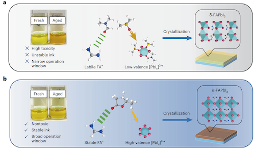 钙钛矿太阳能电池的优势之一是可以通过溶液法来低成本、低能耗地制备高性能器件。目前常用的溶剂是N,N-二甲基甲酰胺和二甲基亚砜(DMF:DMSO),为了提高薄膜的光电性能,还会使用氯苯作为反溶剂来调控钙钛矿的结晶过程。然而,DMF:DMSO和氯苯都是有毒溶剂,因此面临着人体毒性和环境污染的问题。同时,基于DMF:DMSO的钙钛矿墨水还存在着存储稳定性差(小于2天)和成膜过程操作窗口窄(几秒钟)的难题,进一步限制了钙钛矿光伏的大规模生产。此外,由于DMF:DMSO与碘化铅的强相互作用,使得甲脒铅碘钙钛矿(FAPbI3)薄膜制备过程中会先形成黄相非钙钛矿(δ-FAPbI3),然后再经过退火转变为具有光电性能的黑相钙钛矿(α-FAPbI3)。这就导致α-FAPbI3薄膜中存在少量的δ-FAPbI3残留,从而影响了太阳能电池的长期稳定性。