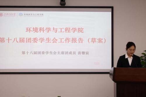 随后,环境学院第十八届研究生会主席团成员黄子宁代表学代会筹备委员会作《太阳集团tcy8722的官方网站第十九次学生代表大会筹备工作报告》。