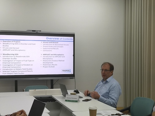 全球范围内频发的野火和冬季取暖燃烧的木柴都可以产生木烟气溶胶,因此木烟气溶胶成为了大气颗粒物的重要组成部分,并对空气质量和人体健康产生了重要影响。Herrmann教授首先介绍了团队在实验室烟雾箱中进行木材燃烧产生有机气溶胶的实验,实验分别研究了木材种类和氧化剂类型对气溶胶化学组成和演变的影响。随后,Herrmann教授介绍了团队在德国农村地区针对木材燃烧产生的气溶胶开展外场观测的研究结果。此外,Herrmann教授还从实验装置和检测手段等方面介绍了对气溶胶中病毒的研究进展和成果,指出深紫外光(UAV)和过氧化氢对病毒都有较强的灭活能力。最后,Herrmann教授介绍了团队对大气中的微塑料开展的实验,认为大气中的微塑料作为气溶胶中一种新组分,对于大气化学组成和人体健康都会产生重要影响,因此有必要开展更加深入系统的研究。