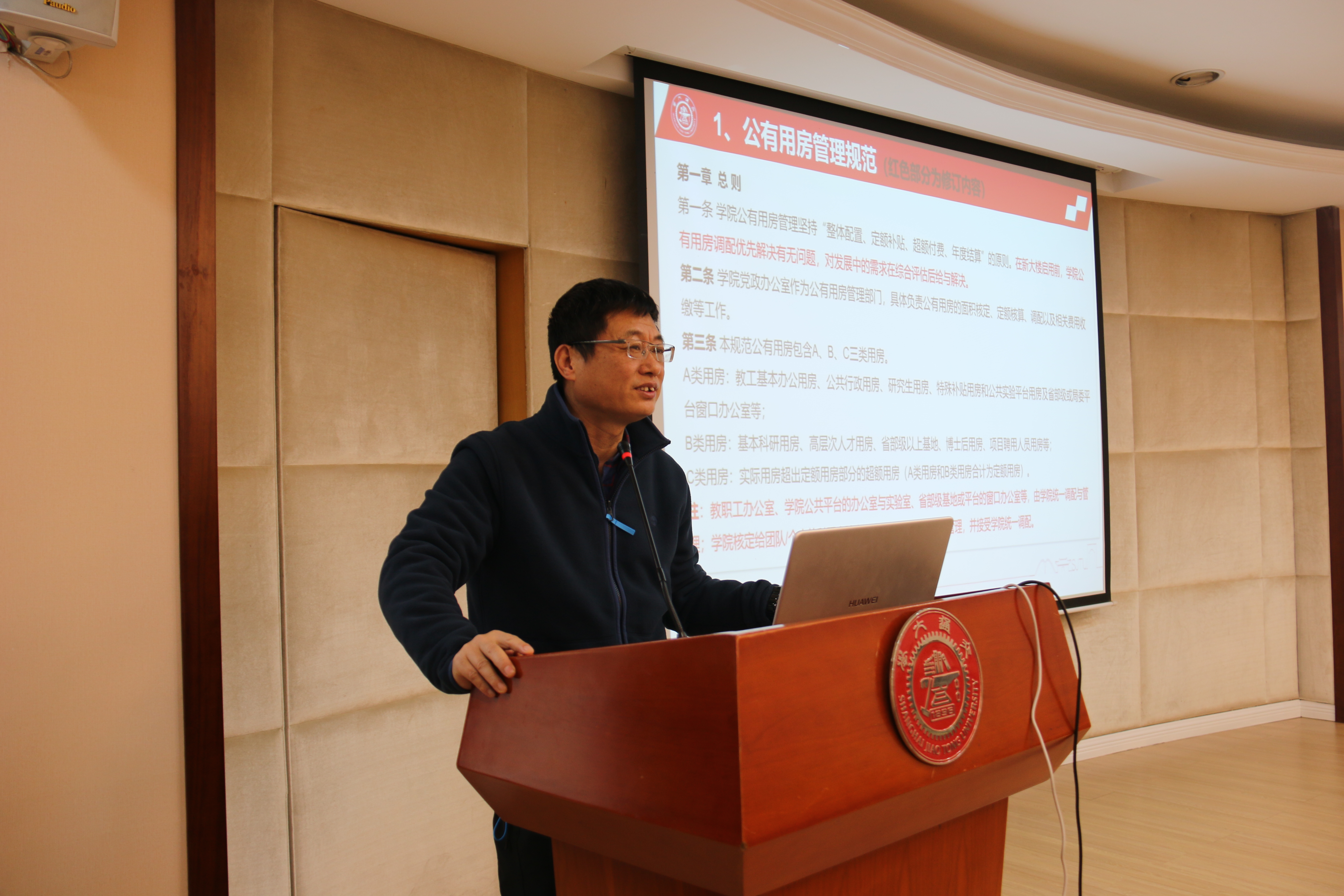 副院长许振明向与会人员介绍了太阳集团tcy8722的官方网站公有用房管理规范、实验室安全管理奖惩机制及实验室大型仪器设备资源共享管理办法。