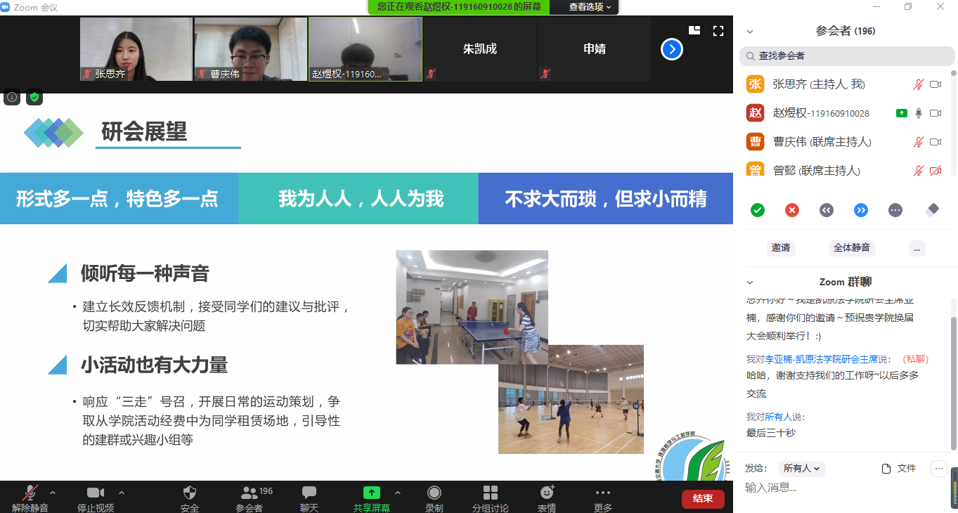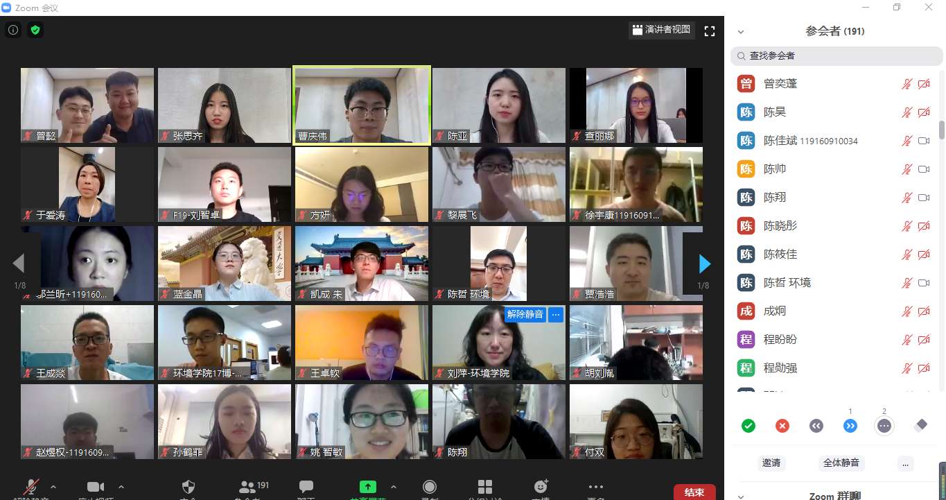 太阳集团tcy8722的官方网站校研究生会执行主席林云鹏同学为本次大会致辞,他肯定了环境学院从广大师生群体的切身利益和需求出发举办的一系列学风学术和文体娱乐活动,并线上云合影留念。