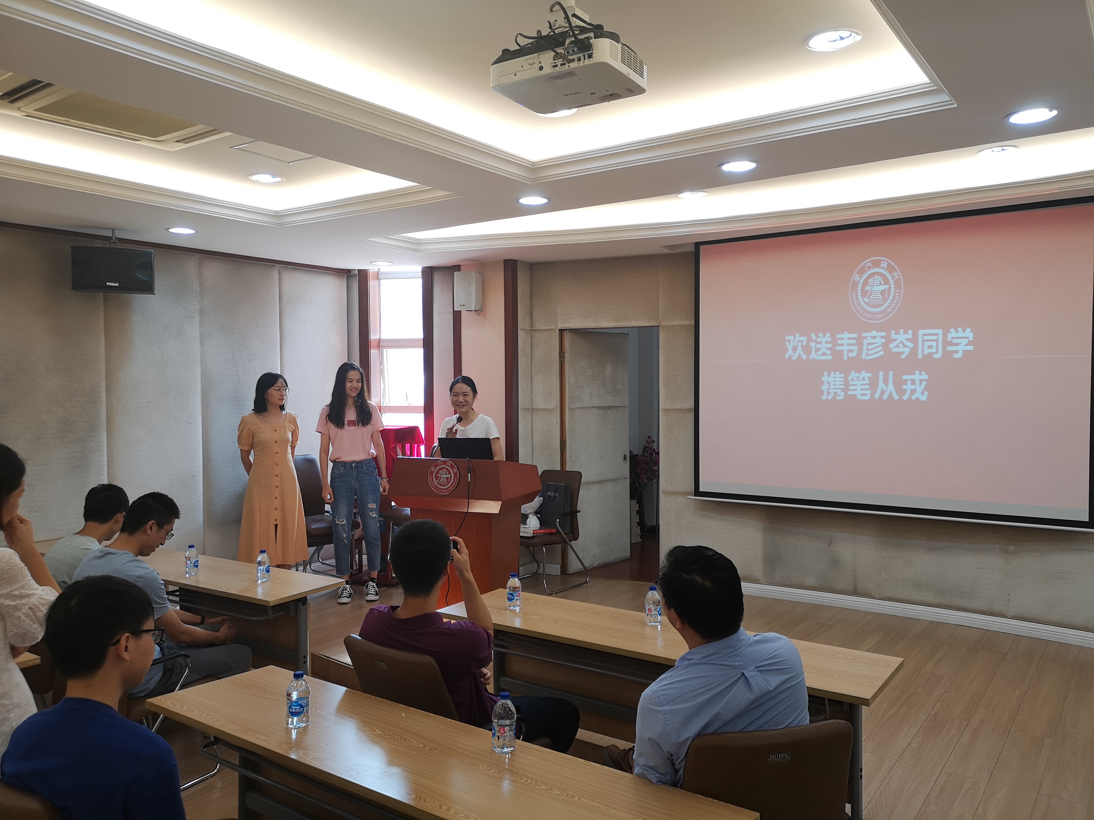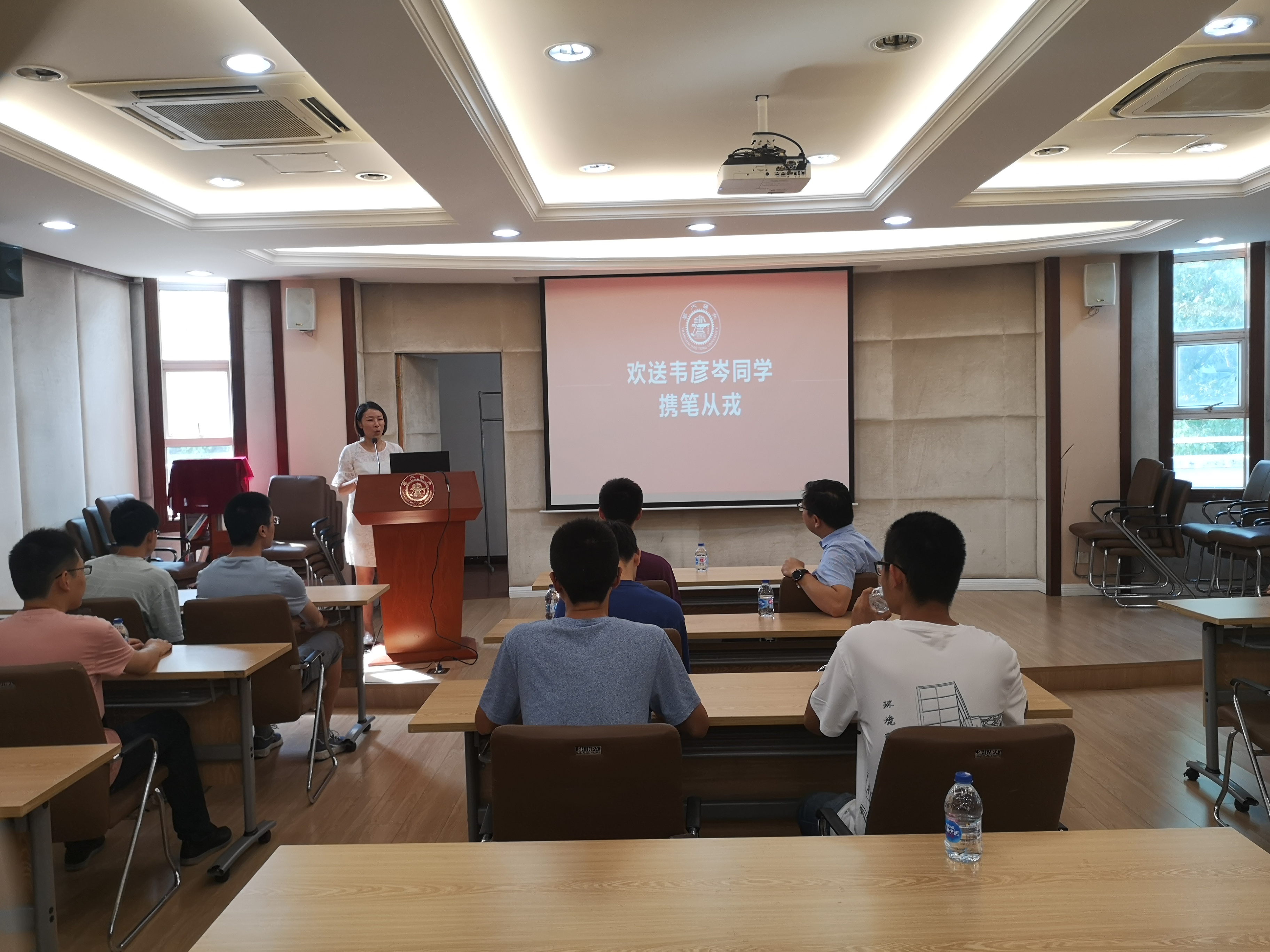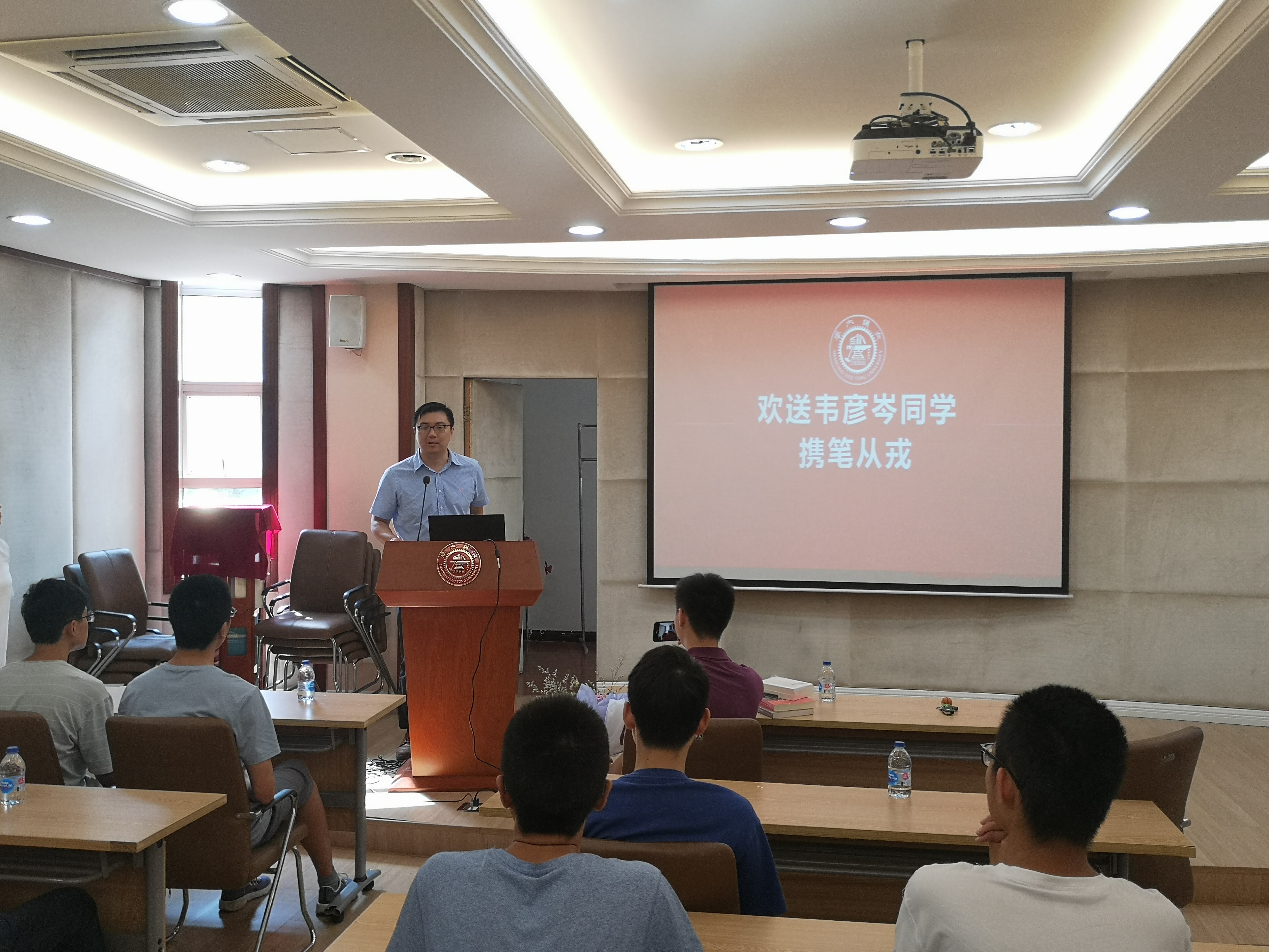 欢送会一开始,主持人于爱涛老师为大家介绍了韦彦岑同学的个人情况,并代表学院表达了对新兵战士的真挚祝福。
