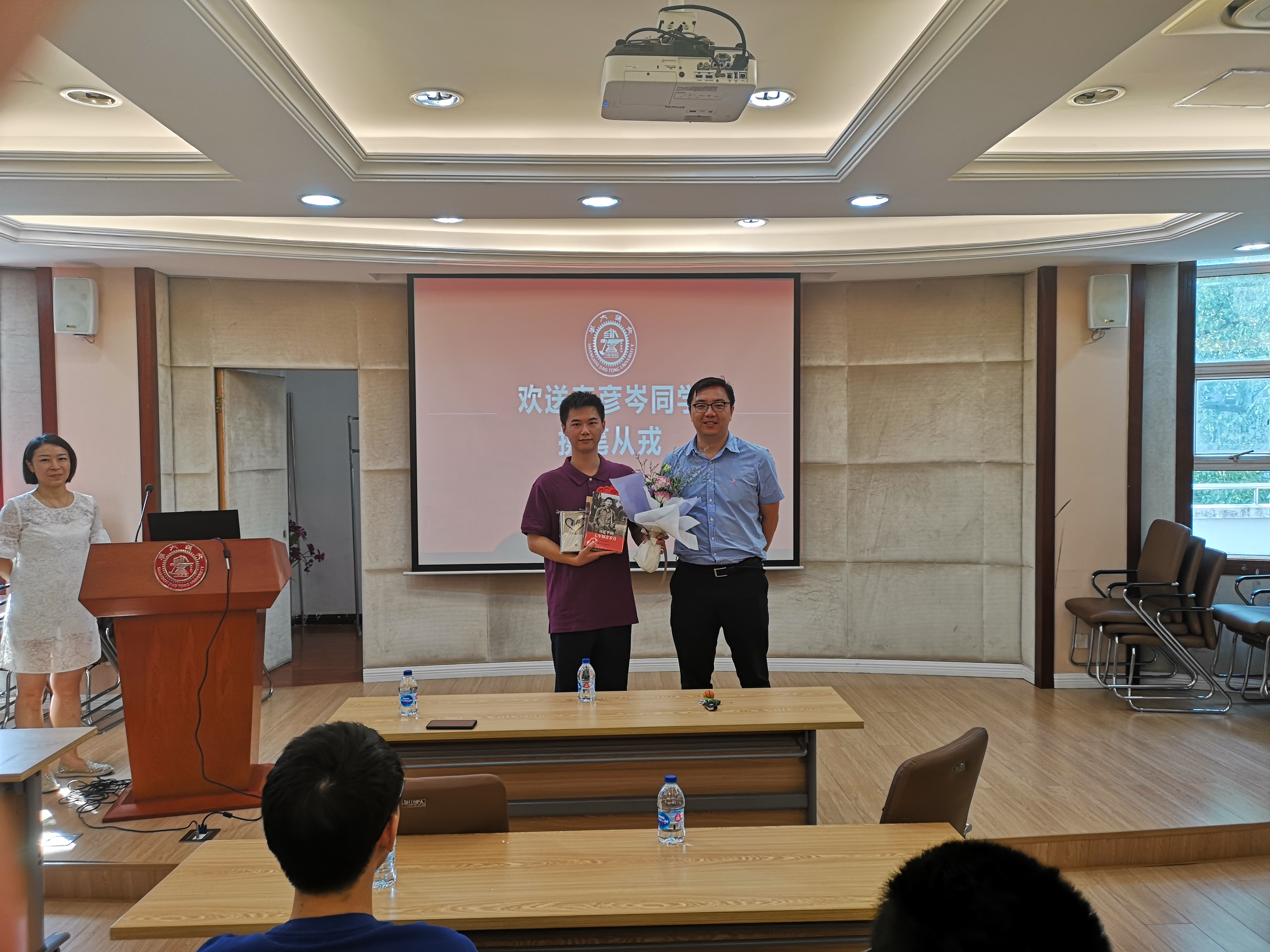活动最后,环境学院党委副书记陈哲老师发言,祝福之余,也提出了对于战士的期望:时刻记得自己交大人的身份,做好一名普通战士的同时,也要发扬交大人的优良作风,把敢于承担,争当先进的品质带入军营。陈哲老师还送上了学院精心准备的学习读物,希望韦彦岑在军营中也不忘学习提高自己,做有思想、有担当、有追求的好战士。