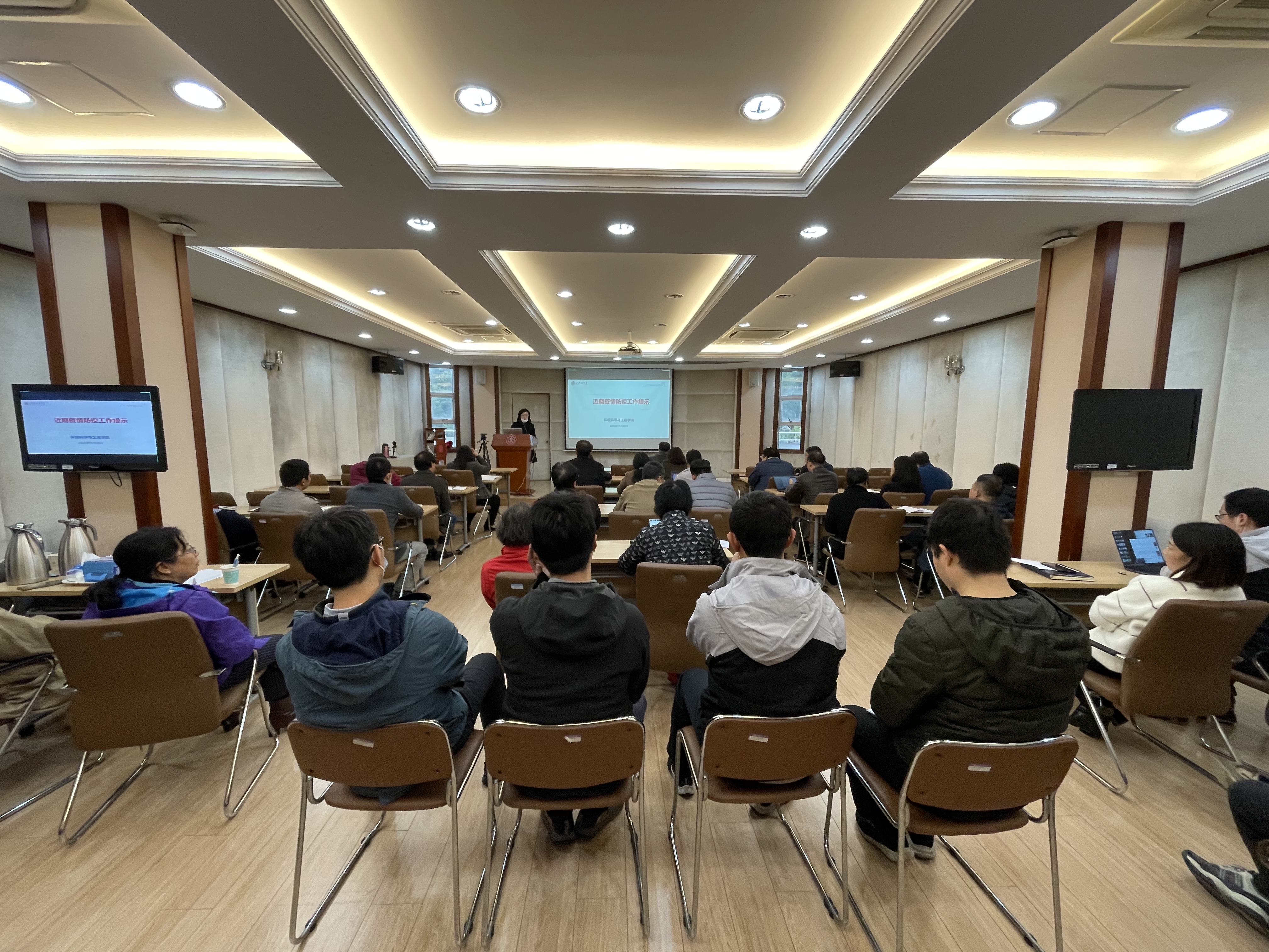 党政办主任王欣荣提示近期疫情防控工作,提醒全院教职工切勿放松警惕,做好个人防护,严格规范佩戴口罩、保持安全距离,并积极配合体温检测、健康码查验、身份核实等校园疫情防控工作。