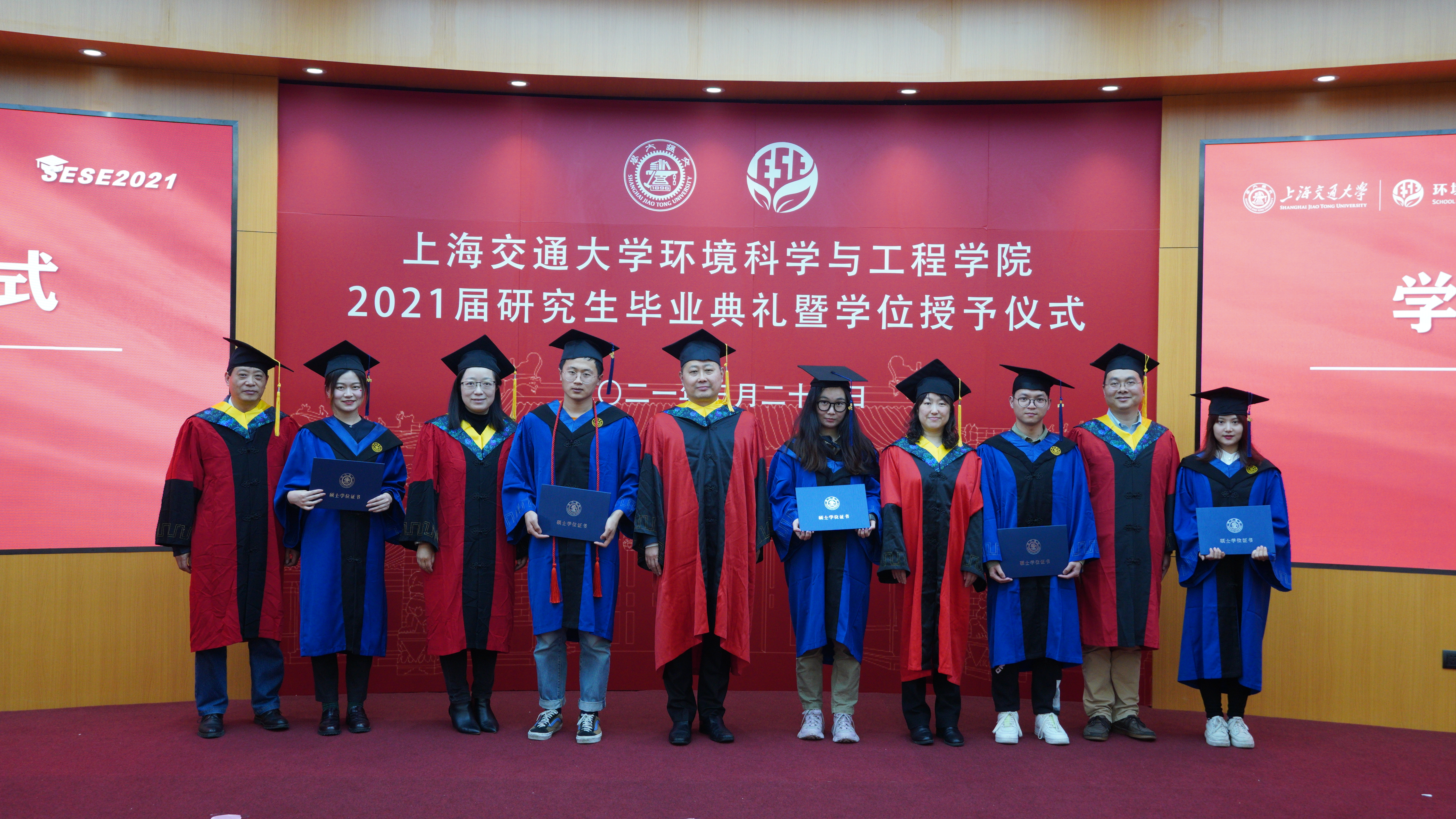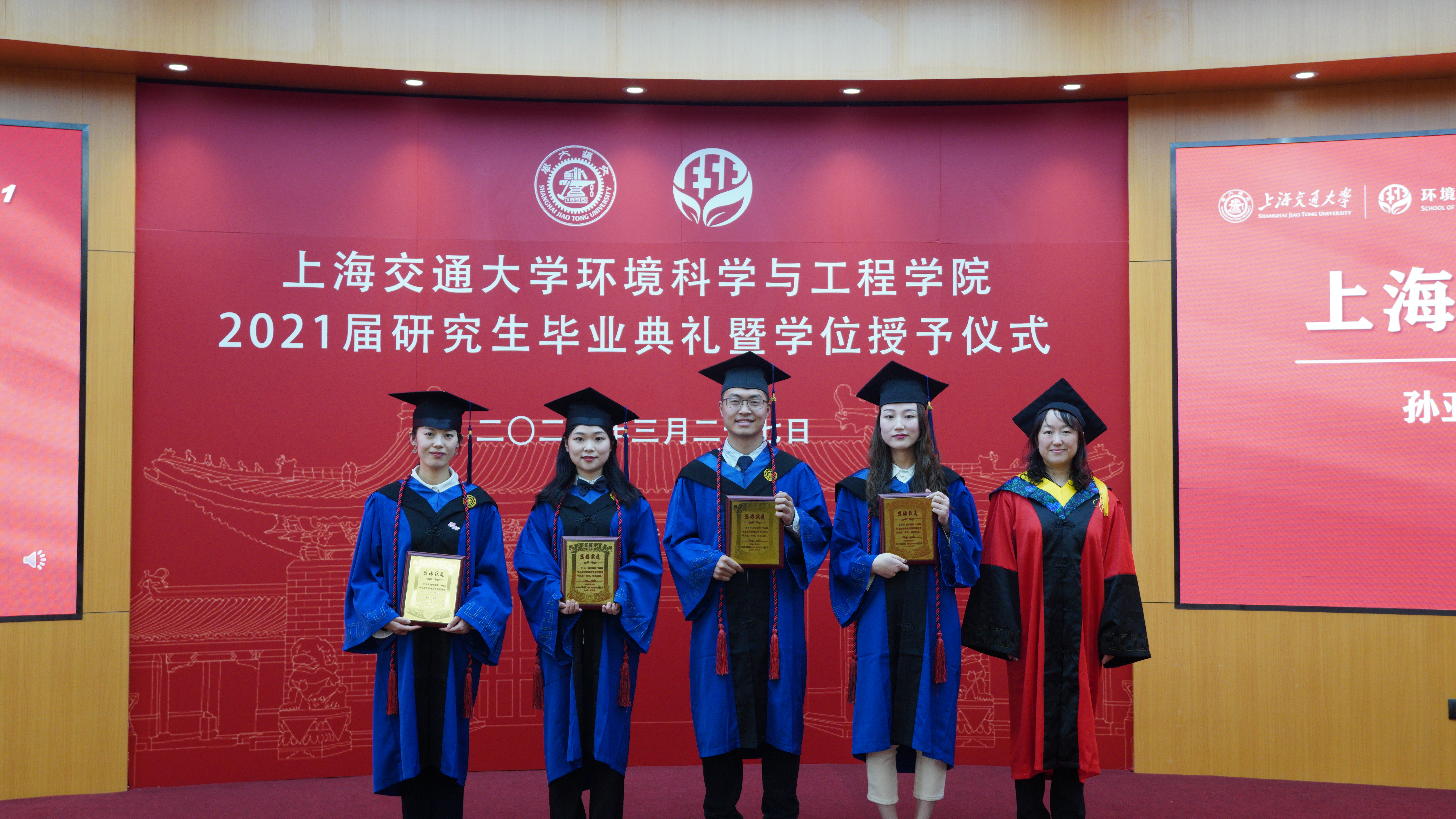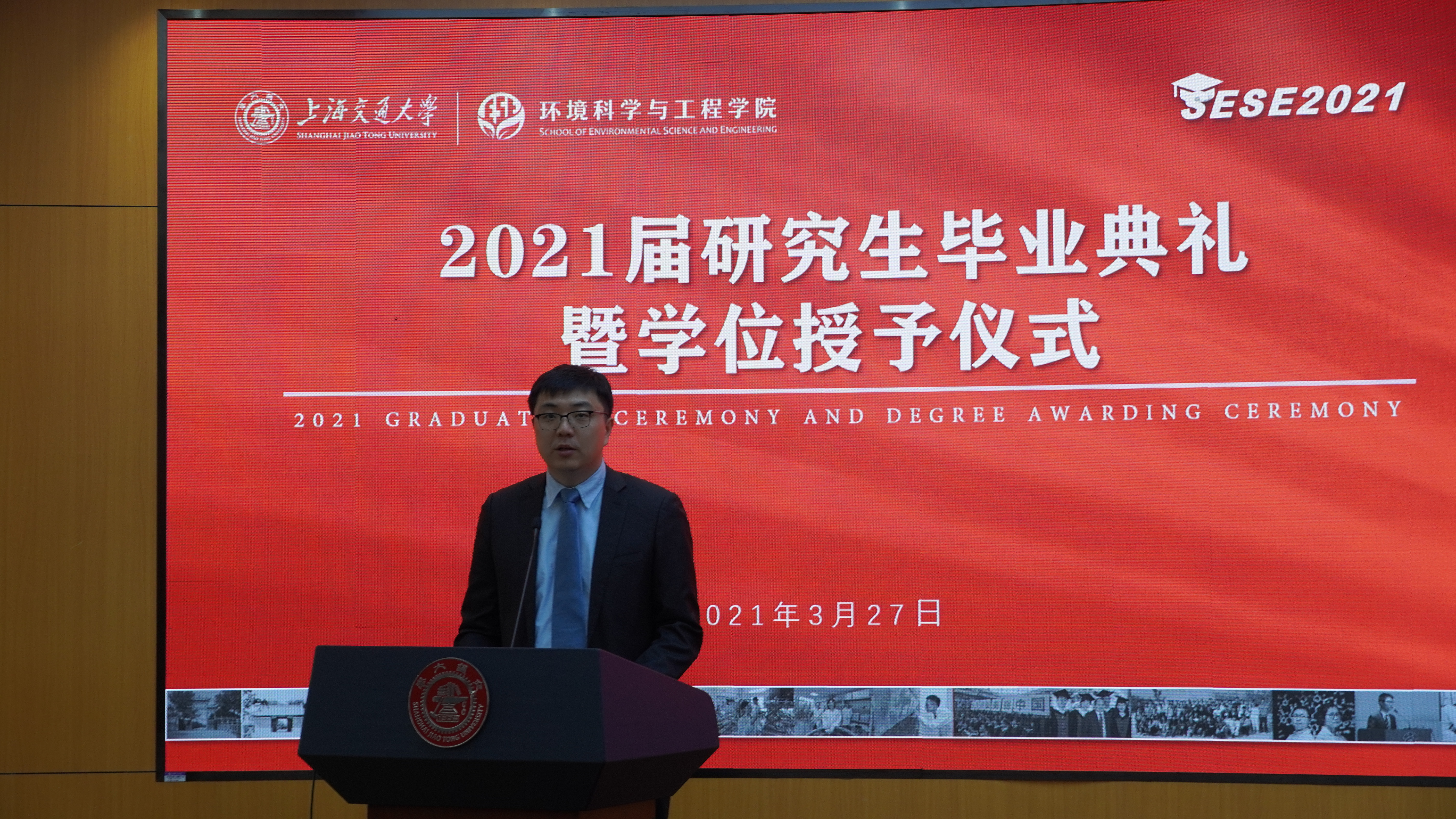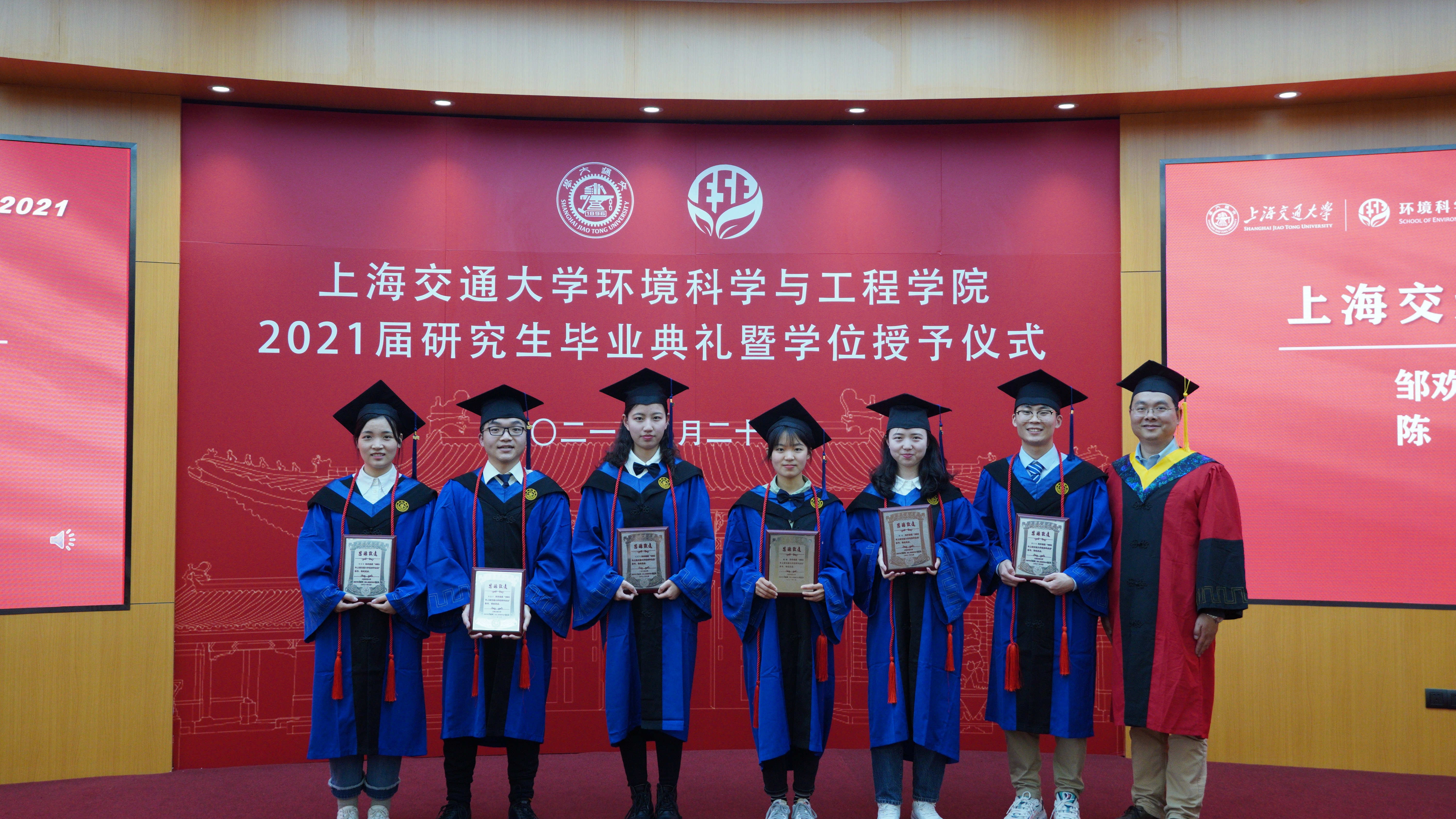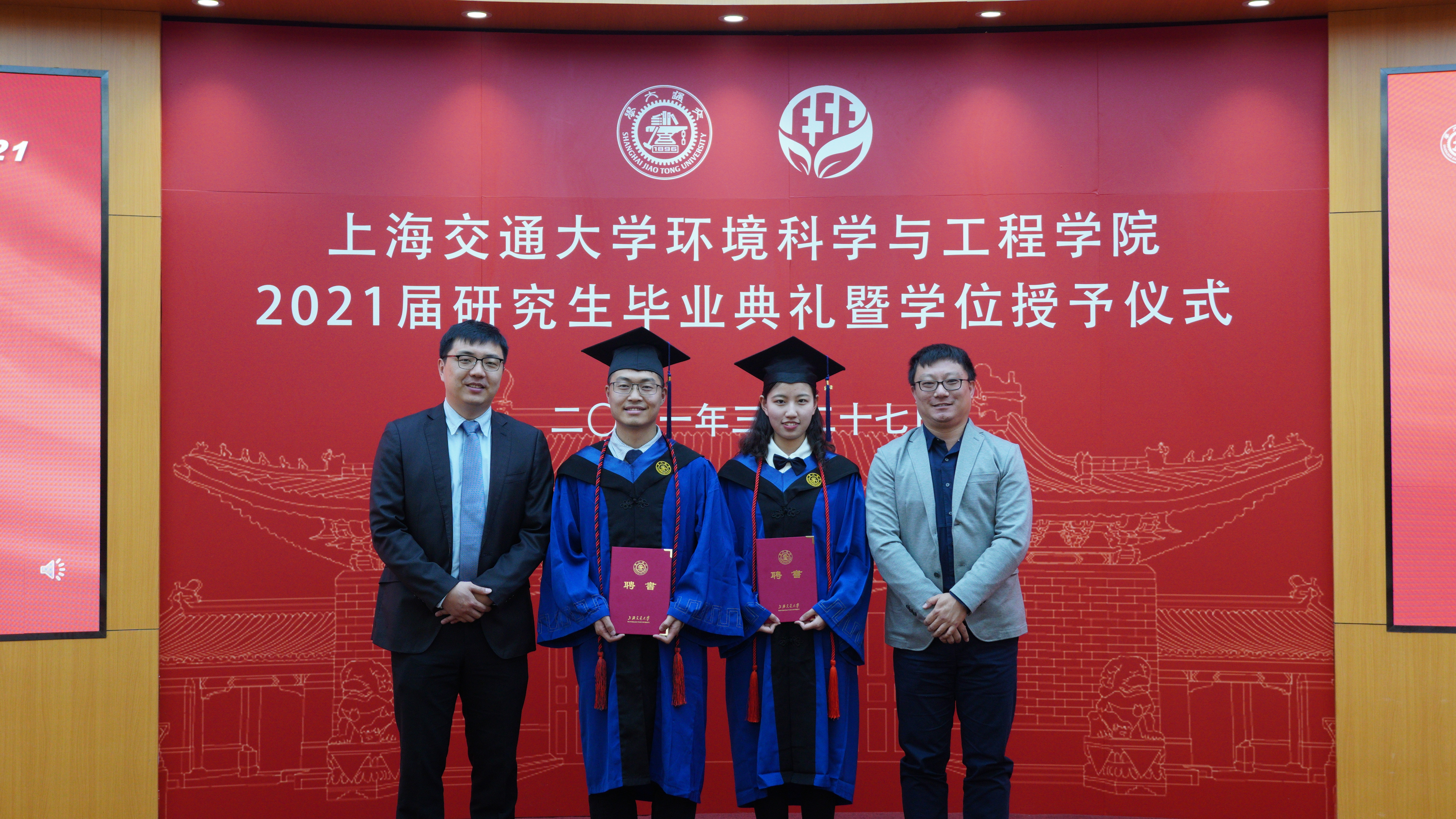2021年3月27日下午,太阳集团tcy8722的官方网站2021届研究生毕业典礼暨学位授予仪式在图书信息楼八楼多功能厅举行。太阳集团tcy8722的官方网站环境学院党委书记胡薇薇,院长耿涌,副院长刘萍、赵一新,党委副书记何圣兵、陈哲,2021届硕士毕业生班主任李彭以及团委书记于爱涛出席仪式。学位授予仪式由陈哲主持。2021届全体研究生毕业生参加本次毕业典礼。