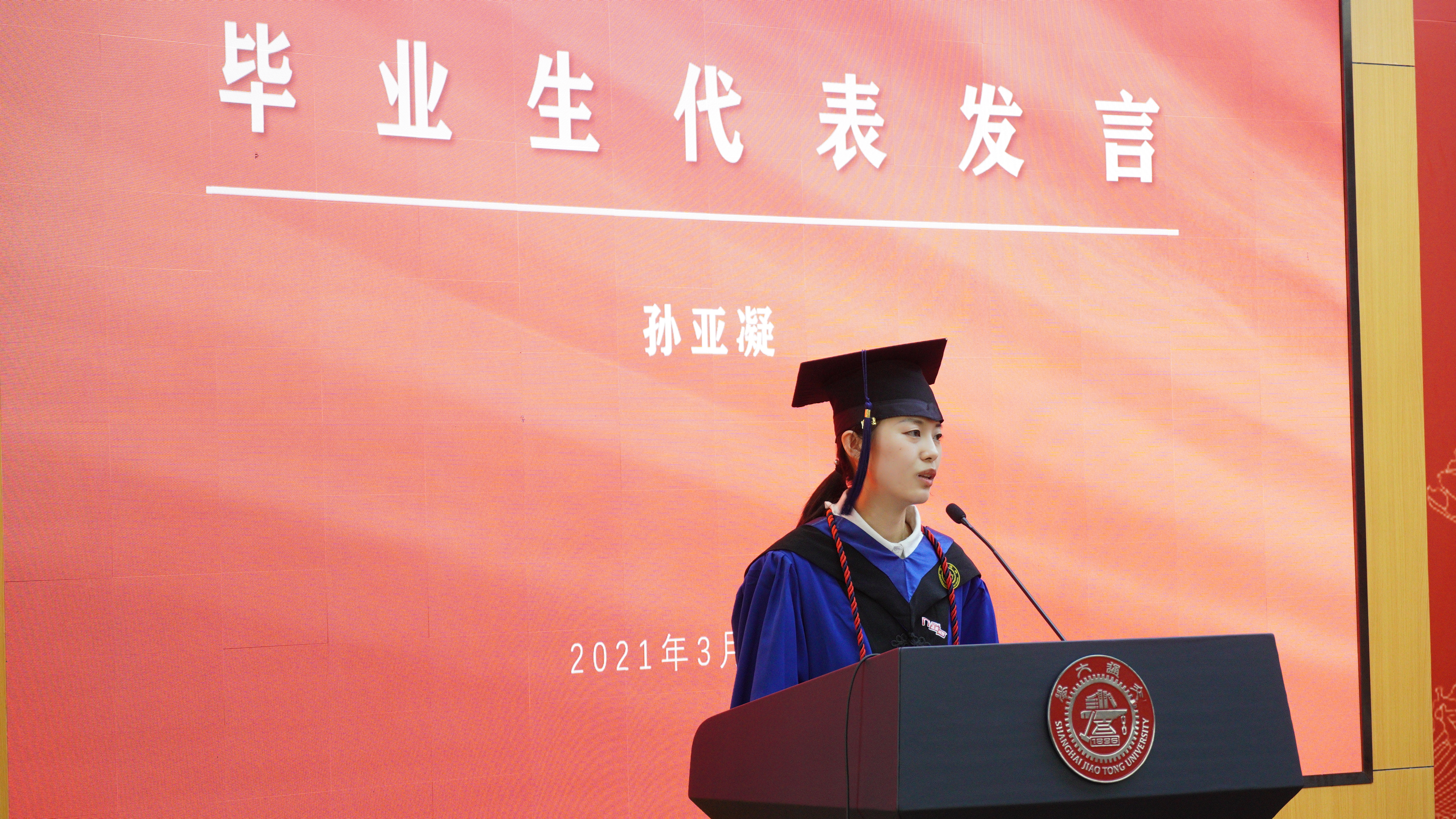 2021届硕士毕业生孙亚凝作为学生代表以《奔流入海,奋斗为楫》为主题发言,她说道:“辞根散作九秋蓬”,昨日在交大度过了最美好的青春年华,从“选择了交大就选择了责任”的开学第一课启蒙,感知 “老人与海”等众多前人不懈奋斗的经历,充实自身;明日将奔入人海,也许征途漫漫,也许风雨兼程,愿以奋斗为楫,乘风破浪,扬帆远航,无愧于“饮水思源,爱国荣校”之校训,无愧于将青春融入祖国的山河的叮嘱!